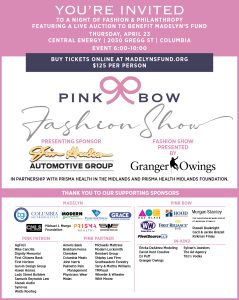 The Pink Bow Fashion Show is presented by Jim Hudson Automotive and benefits Madelyn’s Fund in partnership with Prisma Health Midlands. A special ‘Thank You’ to our sponsors to date––Jim Hudson Automotive as Presenting Sponsor; Madelyn Sponsors–CMLS, Michael J. Mungo Foundation, Modern Exterminating, Prisma Health, Brabham Griffin, Southeastern Freight, Grace Outdoor, Palmetto Citizens Federal Credit Union, and Silent Auction Sponsor, Columbia Metropolitan Magazine; Pink Bow Sponsors–First Reliance Bank, Davidson McNair Group at Morgan Stanley, Fleetsource TK, Walker White, Hood Construction, Russell Bauknight, ACE Glass, Kirkman Finaley, Cecil & Jackie Brazell; Pink Patron Sponsors–First Citizens Bank, AgFirst Farm Credit Bank, Haven Homes, Dignity Memorial, First Horizon, Synovus Bank, Stanek Audio, Samuels Reynolds Law, Lady Street Builders, Garvin Design Group, Watts Roofing and Mike Cancilla; Pink Partner Sponsors–Wheeler & Wheeler, Whit Moore, TMFloyd, Columbia Meats, John Harris, Southeastern Forestry, Ameris Bank, Physicians Wear, Brabham Fence, Cherokee, Palmetto Pain Management, Shipley Law Firm, Midas, Terry & Martha Williams, Modern Locksmith, The Rembert Company and Michaelis Mattress; In Kind Sponsors–Granger Owings, DJ Puff, David Hunt Creative, The Ad Agency, Erika DeAbreu Modeling and Tito’s Handmade Vodka.