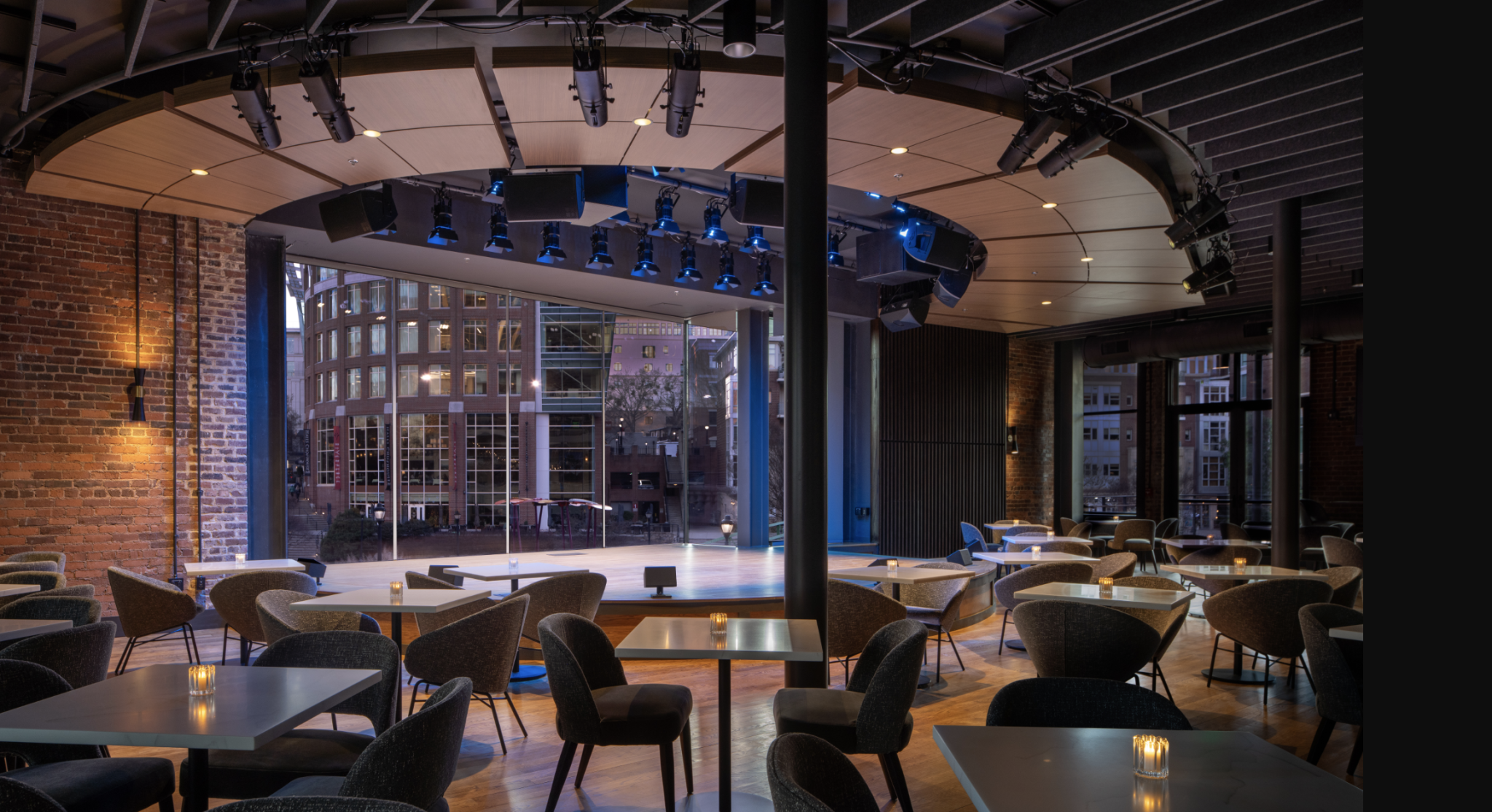 Originally built in 1857 as a horse-drawn carriage factory and blacksmith shop, the historic structure has been reimagined into a modern music powerhouse. Original brick walls and hardwood floors meet sleek, industrial design, while a retractable glass door behind the stage paints a natural backdrop of the Peace Center campus beyond.