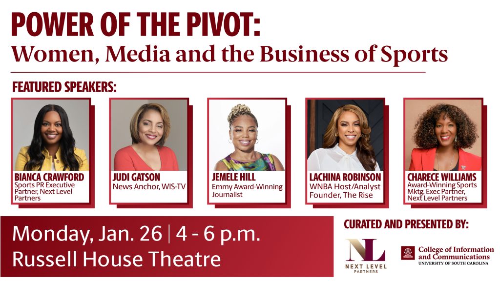 January 28, 2026The University of South Carolina College of Information and Communications (CIC) will host The Power of the Pivot: Women, Media & the Business of Sports, a leadership and career-readiness program featuring nationally recognized leaders in sports, journalism and media, on Wednesday, February 11 from 4:30- 6:30 p.m. The event will take place in the Joseph F. Rice Law School Auditorium in the Karen Williams Courtroom, room 103 on the USC campus, with a reception following in the Taylor House. The event is free and open to students and the public; advance registration is required. Attendees may register at https://form.jotform.com/