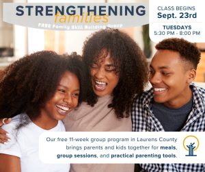 Starting Monday, September 23, Thornwell is offering this free, 11-week program to help Laurens County families build stronger relationships, improve communication, and foster resilience in children. Classes will be held Monday evenings from 5:30 PM to 8:00 PM at 302 S Broad Street in Clinton.