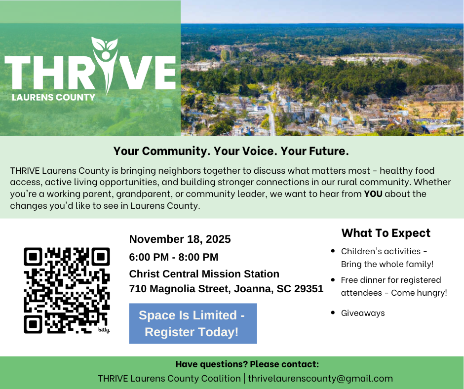 November 7, 2025THRIVE Laurens County, a local coalition dedicated to fostering health, connection, and wellness in rural communities, will host a free Community Listening Session on Tuesday, November 18, 2025, from 6:00 PM to 8:00 PM at Christ Central Mission Station, located at 710 Magnolia Street, Joanna, SC 29351. (Note: This address may appear on Google Maps as 710 State Rd S-30-125, Joanna, SC 29351.)