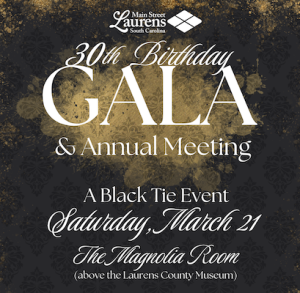 Tickets remain available for the Main Street Laurens 30th Birthday Gala & Annual Meeting, scheduled for Saturday, March 21, 2026, at The Magnolia Room in downtown Laurens. The event will mark three decades of revitalization efforts that have helped shape the downtown district into the vibrant community gathering place it is today.