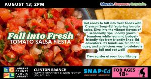 Designed for adults 18 and older, this free, hands-on workshop will be led by Sharon Lone, an educator with Clemson SNAP-Ed, and celebrates the flavor and versatility of locally grown, in-season tomatoes. Participants will learn how to prepare a fresh salsa recipe, discover budget-friendly cooking tips, and enjoy a fun, interactive session that brings a little spice to your day.