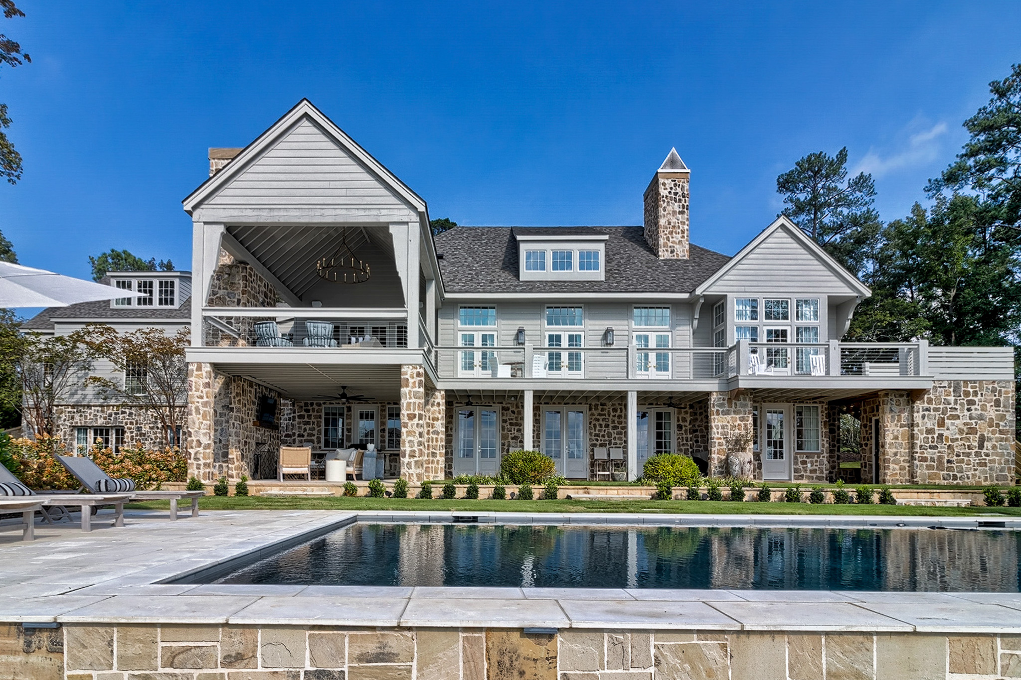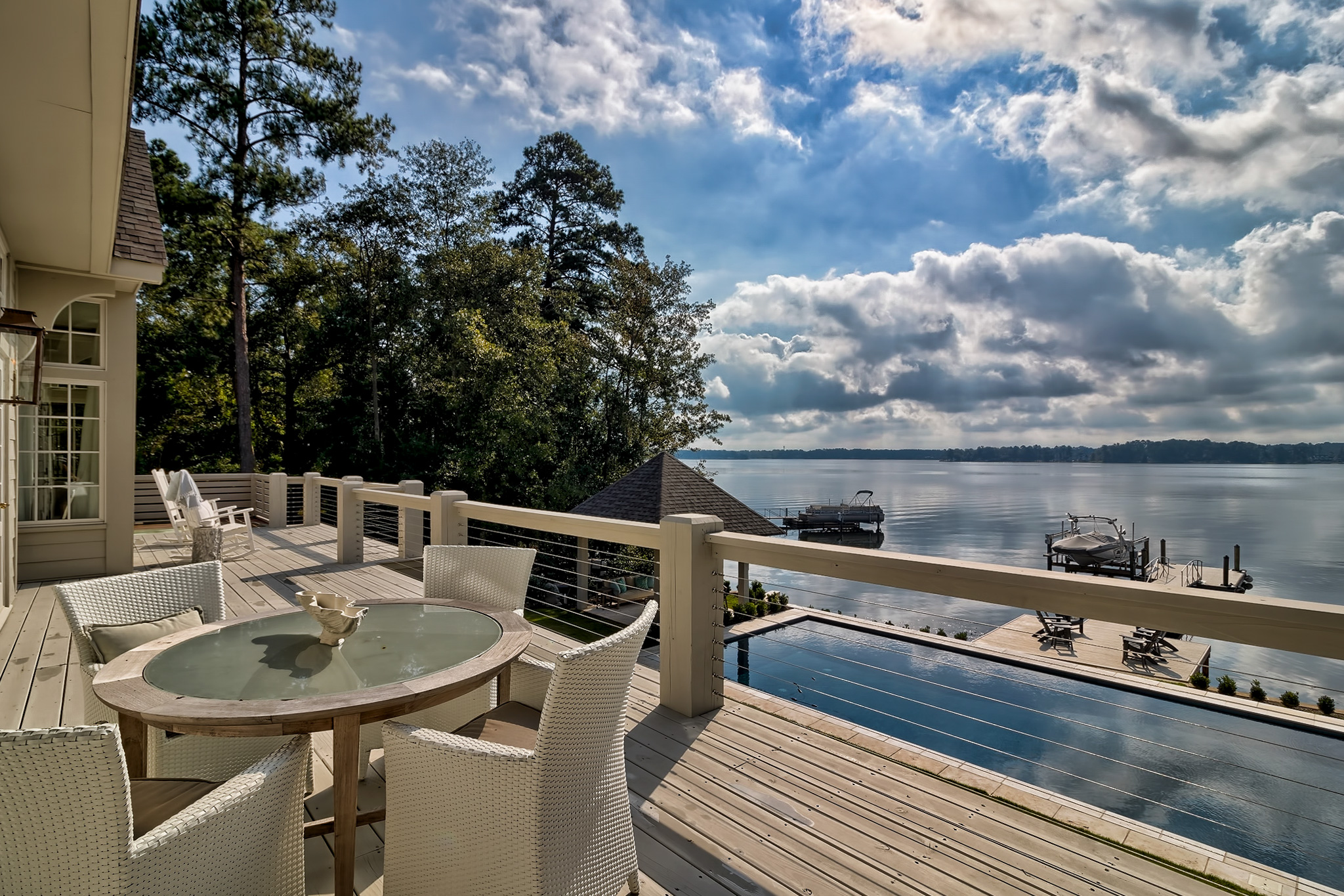 Unique features: English Country architecture by Tippett Sease Baker Architecture and Hedge Design; panoramic views of Lake Murray; expansive outdoor entertainment areas include two large, covered porches with fireplaces, uncovered porch, pool gazebo, illuminated basketball court, Gunite heated pool, private year-round deep-water dock with lift; gourmet kitchen with inset beaded oak cabinets, hidden ice maker, plumbed Miele coffee maker, Wolf coffee mug warming drawer, microwave and walnut shelving with gallery rail, pantry leads to office and drop one with circa 1780 French doors from a Parisian Chateau. Main-level owner’s suite is private and has custom Phillip Jeffries grass-cloth wallpaper, barrel-vaulted ceiling with custom mural, views of Lake Murray, private porch access, 3 closets, large marble shower, soaker tub and dual vanities with make-up vanity. Lower-level features high ceilings, a large family room, two en suite bedrooms, a second full kitchen, gym, bar/billiards room, and a walk-in vault with a Fort Knox in-swing door.