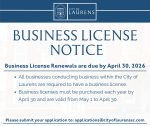 April 7, 2026The City of Laurens is reminding local businesses that annual business license renewals are due by April 30, 2026. All businesses operating within the city limits are required to maintain…