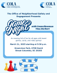 The Office of Neighborhood Safety and Engagement is hosting a Game Night with Councilwoman Tina N. Herbert