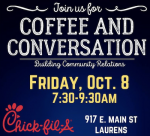 October 4, 2021The Laurens County Sheriff’s Office will be hosting “Coffee with a Cop” on Friday, October 8th from 7:30 – 9:30 am at the Laurens Chick-Fil-A. “Coffee with a Cop gives…