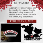 February 4, 2026A local restaurant and a local nonprofit are partnering for a special community fundraiser in downtown Laurens. On Monday, February 9, a portion of sales at Arnold’s of Laurens will…