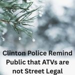 January 25, 2026As hazardous weather continues to impact road conditions, the Clinton Police Department is reminding residents that All-Terrain Vehicles (ATVs), often called four-wheelers, are not legal for use on public roadways…