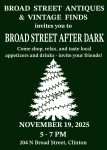 November 11, 2025Broad Street Antiques & Vintage Finds is opening its doors for a special after-hours shopping experience on Wednesday, November 19, from 5–7 p.m. at 204 N. Broad Street in Clinton.…