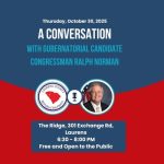 October 13, 2025The Laurens County Republican Party will host a special event featuring Congressman Ralph Norman, a candidate for South Carolina Governor, on Thursday, October 30 at The Ridge in Laurens. The…