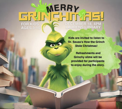 December 6, 2023Get ready for a delightful holiday treat as the Laurens County Library Systems invites kids aged 3 to 10 to a MERRY Grinchmas on December 18, 2024, at 4:00 pm.…