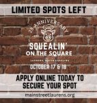 September 9, 2025Main Street Laurens announced today, September 8, that vendor approval emails for the 25th Anniversary Squealin’ on the Square have been issued. Organizers report a strong lineup is coming together,…
