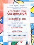 November 9, 2022The City of Laurens will hold a Veterans Day Celebration this Friday. The Celebration is a local tradition honoring the city’s Veterans with live music, biography of local heroes, and…