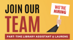 September 28, 2022The Laurens County Public Library is hiring a part-time assistant for the Laurens location. The position needed will work 25 hours a week (Wednesday – Saturday) with starting pay at…