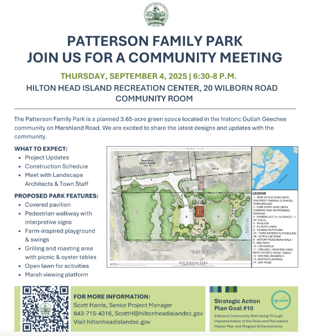 September 2, 2025The Town of Hilton Head Island invites residents and stakeholders to a community meeting to see the latest plans and features for the future Patterson Family Park. The meeting will take place as follows: