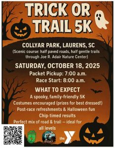 October 5, 2025The countdown is on for one of Laurens’ most festive races of the year. The Trick or Trail 5K will take place on Saturday, October 18, 2025, at Collyar Park, offering participants a scenic mix of paved roads and gentle trails through the Joe R. Adair Outdoor Education Center.