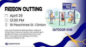 April 25, 2025The United Way of Laurens County invites the community to join in celebrating the grand opening of its new outdoor gym equipment with a ribbon cutting ceremony on Tuesday, April 29 at 12:00 PM. The event will take place at 16 Peachtree Street in Clinton.