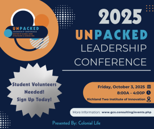 September 16, 2025The 2025 Unpacked Leadership Conference, presented by Colonial Life, is seeking student volunteers to support its upcoming event on Friday, October 3, at the Richland Two Institute of Innovation, (R2i2). Designed to bring together executives, community leaders, and entrepreneurs from across the region, the Unpacked Leadership Conference offers students a unique opportunity to serve, learn, and connect with leaders in a variety of industries.