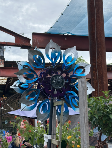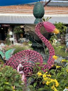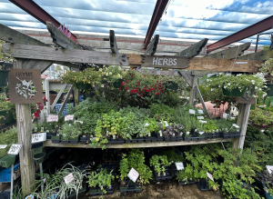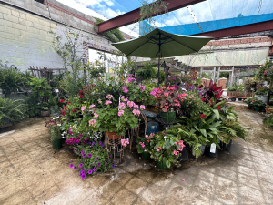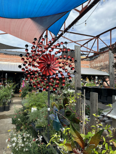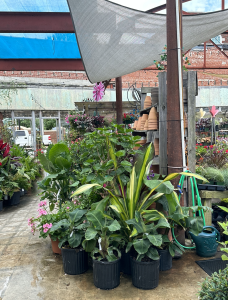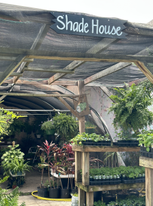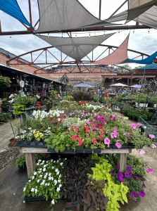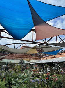 The open-air building has advantages and challenges. The plants in the store are arranged according to the need for sun or shade. The sails in the open area provided an artistic flair to the garden. The gift store portion of the shop is in the back of the store where there is a roof.