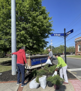 During the work session, volunteers painted four light poles, dug up two flower beds near city signs in preparation for spring planting, and collected three bags of trash.