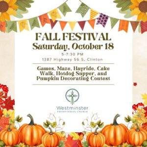 October 6, 2025Westminster Presbyterian Church is inviting the community to celebrate the season at its annual Fall Festival on Saturday, October 18, from 5:00 to 7:30 p.m. at the church campus in Clinton.
